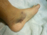幸い職員室の先生がまだ残っていたので無事にシャッターを上げて貰ったんだけど、そこからバイクを出す際、左のふくらはぎに肉離れを起こしてしまった。 バイクを押してスロープを上がろうとしたら、突然ふくらはぎに鉄パイプのような物で殴られたような痛みが走った。最初はてっきり何かの荷物を落としたか、バイクの部品にぶつかったんだと思った。そのくらい、モロに「棒で叩かれた」感じの痛みだった。 その直後から左脚をついて歩けなくなり、バイクのギアシフトも爪先で上げる動作が非常に辛かった。 なんとか帰宅して患部を見ると、ソフトボールでも入ってそうなくらいに丸く腫れている。触るとパンパンに内圧が掛かってて、ちょっと押しただけで強烈に痛い。やむなく室内ではピョンピョンと片足で移動。 ネットで肉離れの応急処置を調べて、とりあえず冷却ジェルで患部をアイシング。横になって心臓より高い位置に脚を上げておく。断裂した筋組織から出血して腫れと炎症を起こすらしくて、出来るだけそれを回避するための措置らしい。 ほんの30分程度で小降りのメロンサイズまで急激に腫れたのは、たぶん出血が止まらないクスリのせいだろう。炎症による熱も相当出ているようで、最初に当てた冷却ジェルは1時間もしないうちにぬるくなってしまった。 深夜2時にJAXAのサイトでH2Bロケット打ち上げを生中継で眺めてから、患部の冷却ジェルを新しいのに取り替えて就寝。今夜はとにかくこれ以上の腫れを防がないといけない。 朝になって試しに立ってみたら、コレがもう激ヤバな痛み。たぶん、安静にしていた間に患部が硬直してて、それを急に動かしたからだろう。マトモに歩けないので、やむなく整形外科に行くことにする。 最寄りの外科は徒歩でも10分程度の距離だけど、歩くのは無理なのでバイクで向かう。結構混んでいたものの、30分ほど待って受診。 診察台にうつ伏せになって、腫れている左脚と正常な右脚を比べるようなアングルで写真を撮る。先生はなんか普通のデジカメで撮ってたけど、治療の記録用なんですかね。 あとは触診で痛む範囲を特定して、アキレス腱が無事なのと筋全体の断裂じゃないのを確認。中度の肉離れという事で、湿布と包帯による圧迫止血。松葉杖を出しときますという先生に、バイクで来たんですけどと答えたら半ば呆れ顔。 動かすと断裂が悪化する事もあるし、杖をついて貰わないと…と言うので、帰途に薬局でステッキを買っていきますと答えておく。 数日分の湿布と痛み止め、腫れと炎症を防ぐ内服薬を出して貰う。幸い、二千円も掛からずに済んだ。 帰途、ドラッグストアに寄って折りたたみ式のステッキ杖を購入。六千円もする上に、どれもこれもジジババ模様でゲンナリ。確かにこの杖の利用者は高齢者が殆どだろうけど、年配の方々がみんなこういうダサダサの柄が好みって訳じゃないだろうに。あまりに高齢者を馬鹿にしたデザインじゃなかろうか。 仕方ないので一番シンプルそうなのを選ぶ。落ち着いたら自分でサイバーな柄に塗り直してやろう。ウチらしく黄色と黒の警告柄にでもするかな。いや、ガンメタルに塗って武器っぽいディテールを付け足すのも良いかも。 完治するまで数ヶ月は掛かるようなので、その間の再発を防ぐべく、テーピングも大量に補給しておく。 せっかくのサイト創設八周年だというのに、なんともトホホな1日。 |