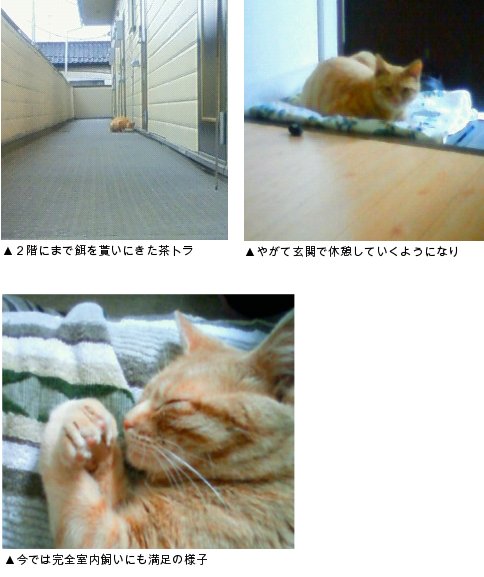 手を差し出すと少し逃げるものの、またすぐに戻ってくる。 2階に引っ越してからは野良猫さんたちとの交流もなくなっていたのだが、この茶トラは2階通路も巡回経路に入っていたらしい。 とりあえず小皿にカリカリを入れて玄関先に出しておいたら、数時間後に確認したときには綺麗に平らげていた。 そのまま茶トラは定期的に通うようになったのだが、どうも様子が少し変だ。 とにかく良く鳴く。 野良生活では無駄鳴きするとデメリットが多いと思うのだが、玄関先に到着したらまずひと声ニャー。 それに気付いて扉をあけて目があうと、挨拶らしきニャー。 カリカリ出して無心に食べている間は静かなものの、食後はひたすらこっちの顔を見つめてニャーニャー。 おかわりが欲しいのかと思って出してみても、食べずに鳴き続ける。 撫でて欲しいのかと手を差し出すと、やっぱり距離をとりつつニャー。 結局、扉をしめて放置すると暫く鳴いたあとどこかに帰っていくという状態が数日続いた。 そんな「餌くれ定期便」に慣れたころ、扉を開けるとヘッピリ腰で玄関の中に入り込むようになった。 小一時間ほど玄関で休憩させてから帰らせていたのだが、数日目に尻尾付近の怪我を発見した。 かなり大きなかさぶたが出来ていて、盛り上がりも厚いところを見ると結構な深手だったらしい。 もしかしたら怪我が治るまで保護を求めているのかも知れないと思い、自分で外に出たがるまでは追い出さない事にしてみた。 結局、そのまま茶トラは我が家に逗留中。 野良のくせに全く外へ出たがらない。玄関を開け放っても、玄関先を数歩探索してすぐ戻る。 最初は軽く撫でさせる程度だったのが、翌日には自分から寄り添ってくるようになり、更にその翌日には抱っこを求めてくる始末。 およそ野良猫らしからぬ甘えん坊っぷり。 もしかしたら近所の飼い猫で放し飼いなのかもと思い、迷子猫サイトや地元紙の情報を確認してみるものの該当なし。 思案した挙げ句、即席の首輪に「仮保護中です。飼い主さん居られますか」と書き込んで早朝から外に出してみた。 結局、その日の夕方に仕事から帰ってみると、待ち受けていたかのように茶トラが玄関先に。 首輪もそのままだったので、純正野良と判断して尻尾の怪我が完治するまで完全室内飼いで保護することに決めた。 …のだが、このあと衝撃の展開が待っていたのでした。 つづく |
