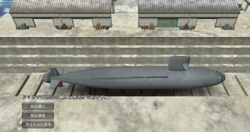 前作では登場する全ての艦が架空のものだったため、潜舵や縦舵、スクリューといった部品は勿論のこと、涙滴型や葉巻型といった船体に至るまでカスタム可能にしたが、今作は全て実在の艦を登場させるのでシステム的にそぐわないと思ったからだ。 ところが色々とテストプレイできる段階になってみると、レベルアップで高性能な艦を購入して乗り換えるだけという流れに、ひどく物足りなさを感じた。 散々迷った結果、船体は艦ごとに固定だがその他のパーツはカスタム可能にするという方向でシステムを改良することにした。 そのため急遽、パーツ購入&換装用の乾ドック画面を突貫工事で用意。ドックのモデルはひと晩でなんとか形になったものの、換装用のパーツモデルは全く用意してなかったので、これから大量に作らないといけない。 とりあえず換装システムのテストを兼ねて、スクリューをポンプジェットに変えてみた。 ちょっと画像では分かりにくいかも知れないけど、退役間近の海自はるしお級に原潜用のポンプジェットの組合せ.....意外とカッコイイかも。