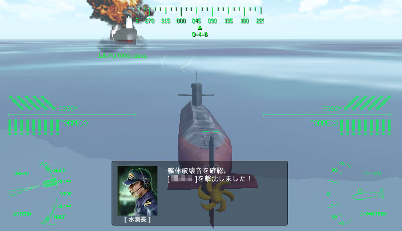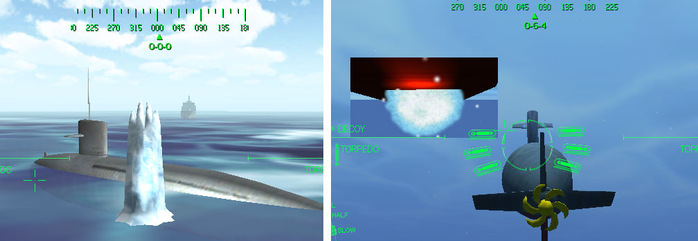 開発が一番進行している「魚雷戦用意2」は、プレイヤー以外の艦のモデリングとゲームバランス調整の段階。 それと、テストプレイ中に気になった点を幾つか修正中。それが今回の画像なんだけれども、まずひとつめは水上艦からの砲撃。 そもそも現代の潜水艦が戦闘中に海面へと浮上することなんて無いけれど、ゲームなのでいつでも浮上することは可能になっている。当然ながら敵の水上艦から目視攻撃されないとおかしいので、艦載砲を持つ艦からは砲弾が飛んで来るように改良。 もうひとつは、魚雷の発射と命中時にサブカメラによる映像を追加したこと。メインカメラが自艦の背後からのアングルなので、魚雷を発射した時に肝心の魚雷が見えず、いまひとつ臨場感に欠けていた。同様に、遥か遠方にいる敵艦に魚雷が命中した際に、水中の透明度が高くないので殆どなにも見えない状態だった。これではゲームとしてプレイ中の満足感が半減してしまうので、サブカメラで発射や命中の様子を見られるようにした。 ジェット戦闘機のフライトシミュレータなんかではお馴染みのミサイルカメラと同じ原理。