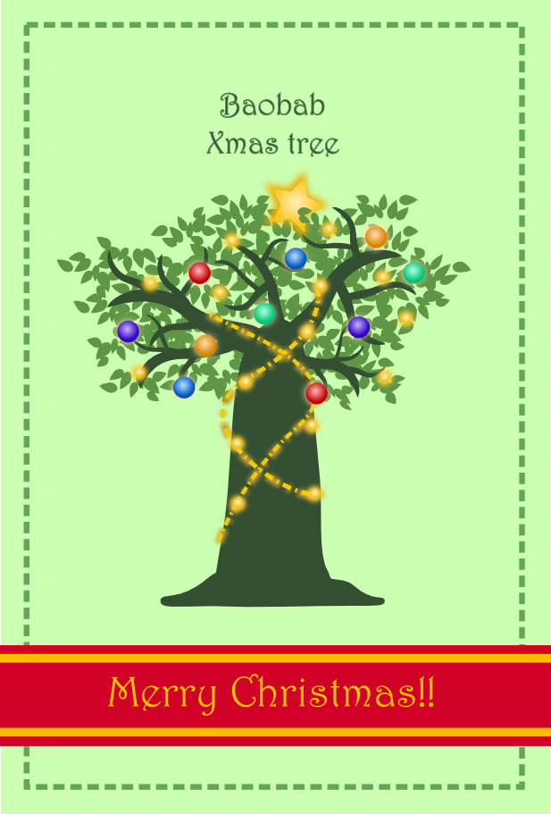 とか書いてる最中に地震.....かなり揺れたけど速報値は震度3。 なんか最近、異常なくらいに各地の火山が活発化してるのに殆ど報じられないし、震度や火山活動に関する発表内容に不信感を持ってしまう。 さてさて、Xmasでも大学はまだ後期集中講義期間中で週末まであいてるので、ヤル気のある学生さんは授業がなくとも登校して来て自習や課題をやってる。 独学では大変そうな内容を抱えてる学生さんのために、こちらもボランティア出勤で対応。普段は授業時間などの制約があって充分に教えられないことも、ここぞとばかりに贅沢なマンツーマン授業。 「なんでギャラも出ないのにそこまで付き合うの?」と良く聞かれるんだけれど、自分が学生だった頃に指導者の方々にやって欲しかった事を実践するよう心掛けている。 なにより、学生さんのお役に立てるのは自分のモチベーション維持にもつながる。 画像のクリスマスカードは、今年ご縁のあったアフリカにちなんでバオバブツリー。